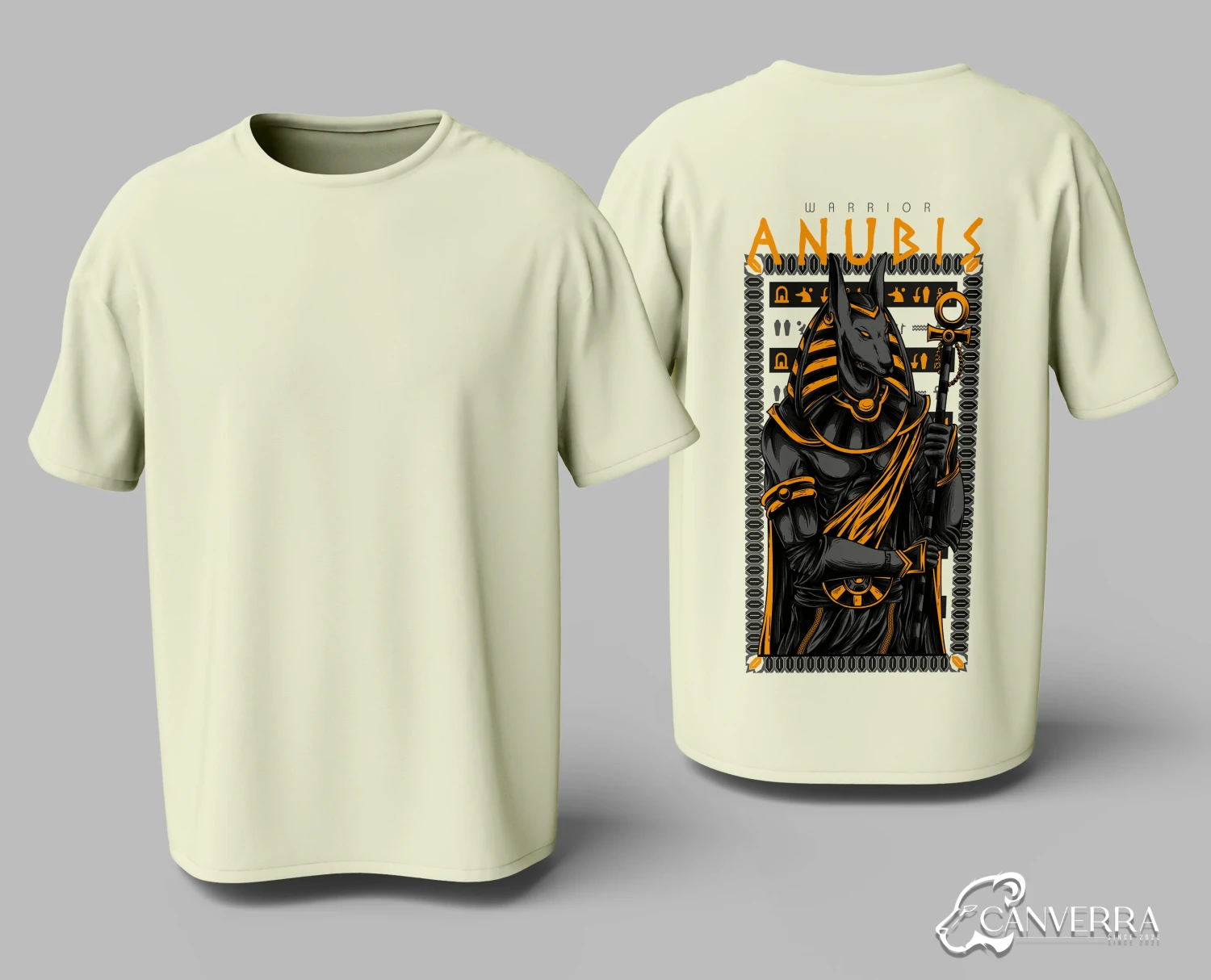 Striking Mythological Graphic: Features a bold, detailed back print of Anubis, the Egyptian warrior god.