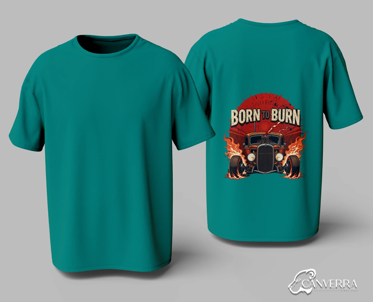 Classic Hot Rod Graphic: Bold "Born to Burn" design with a flaming vintage car on the back.