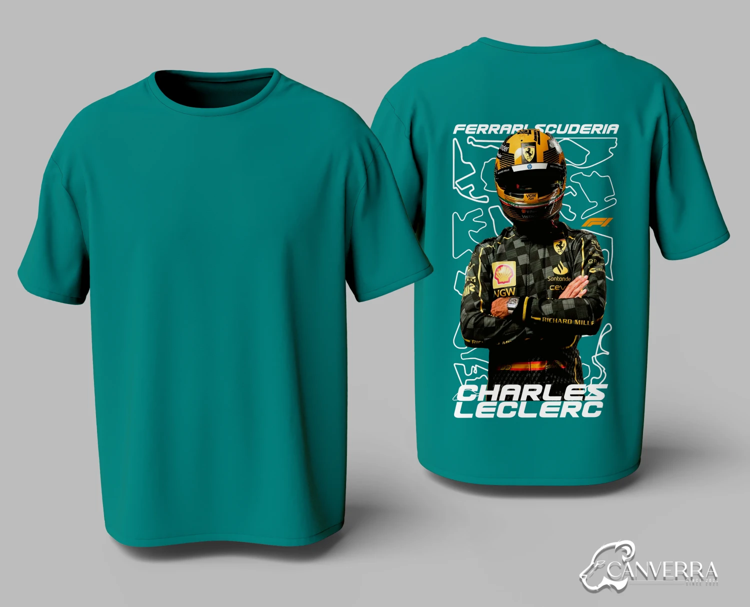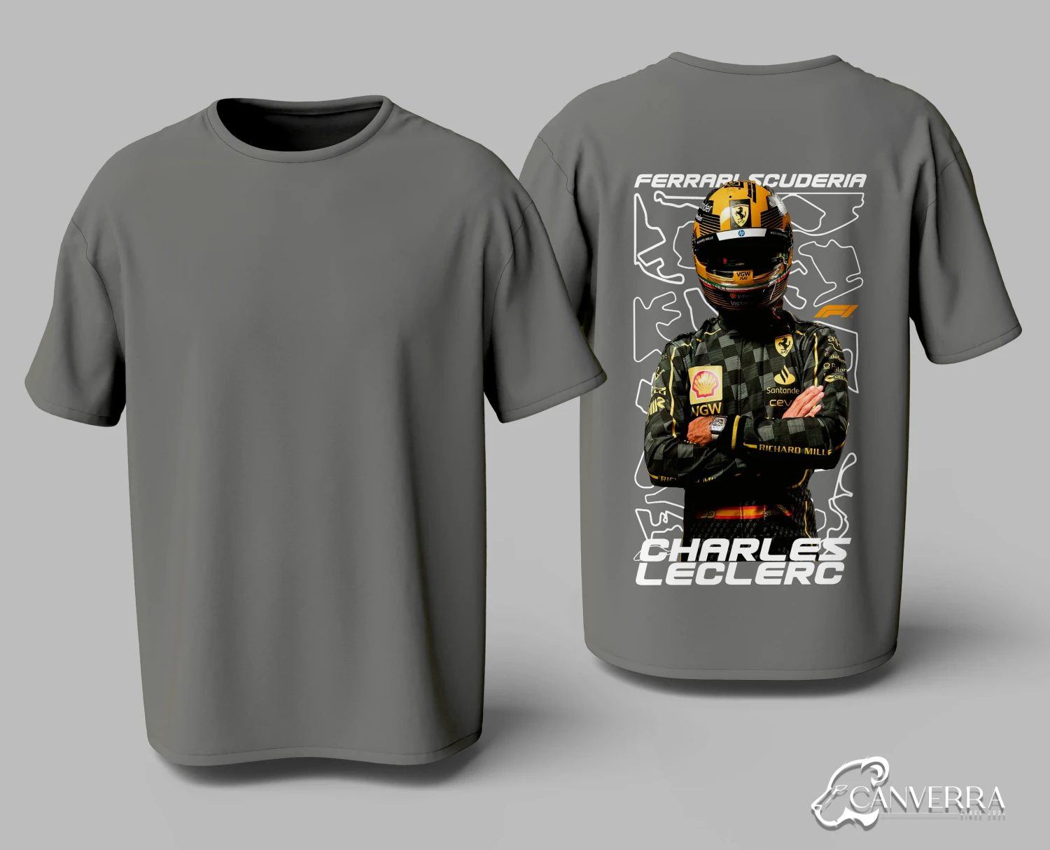 Driver Tribute Design: Features a bold back print of Charles Leclerc in his Ferrari race gear, set against a stylish track outline.