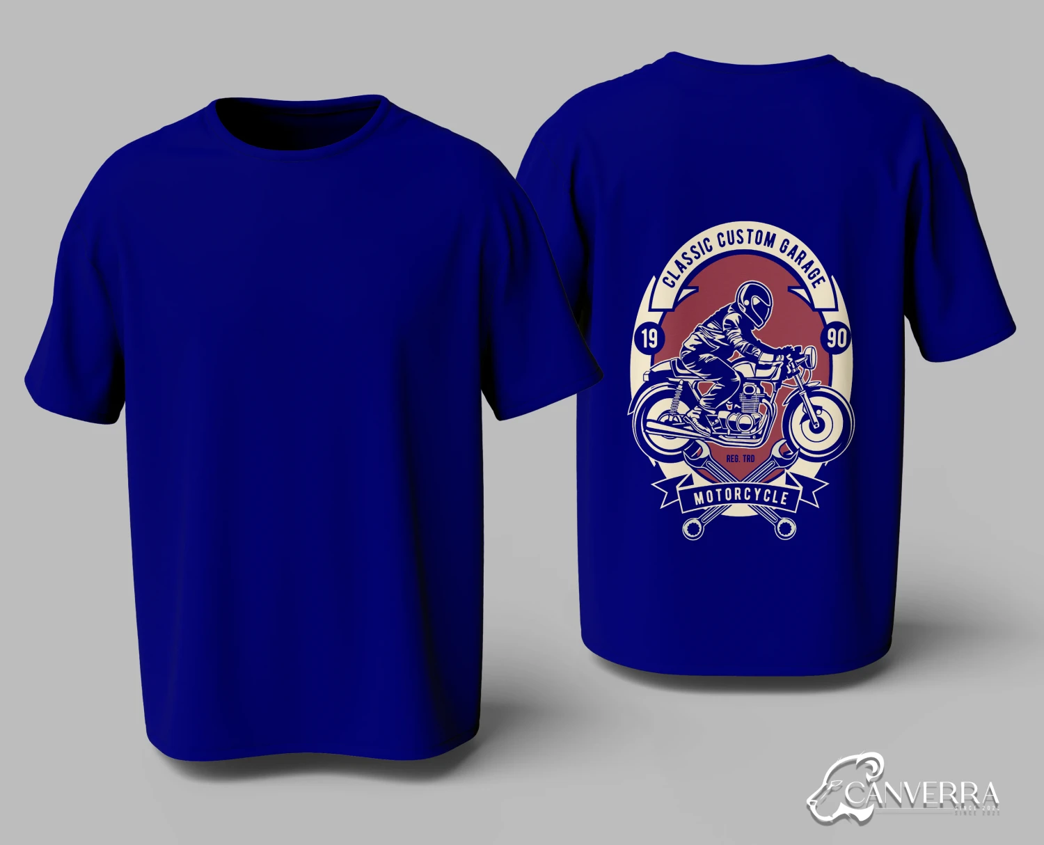 Vintage Biker Design: Features a retro "Classic Custom Garage" motorcycle graphic on the back.