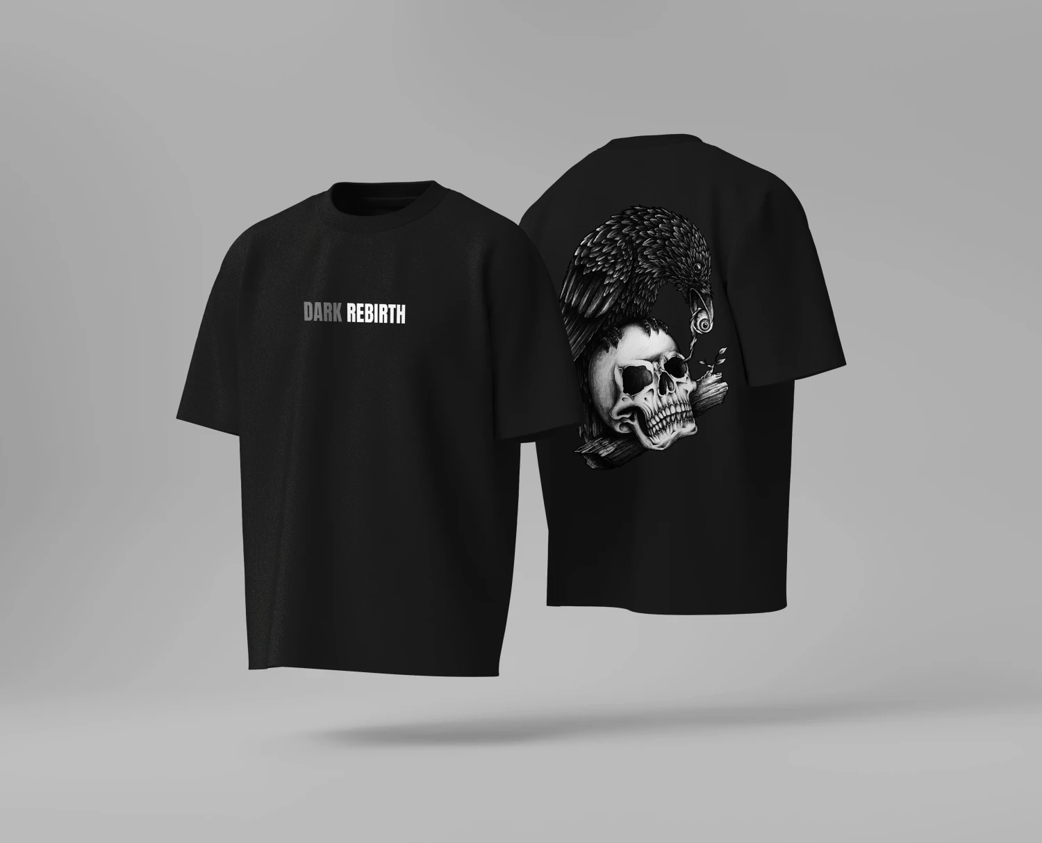 Embrace the shadows with the "Dark Rebirth" graphic tee. This shirt features a clean "Dark Rebirth" chest logo and a stunning, large-scale back print of a crow perched on a skull, blending gothic and tattoo art styles. Crafted from premium 240GSM combed cotton with a durable DTF print, it offers a structured, comfortable fit for any darkwear or alternative look.
