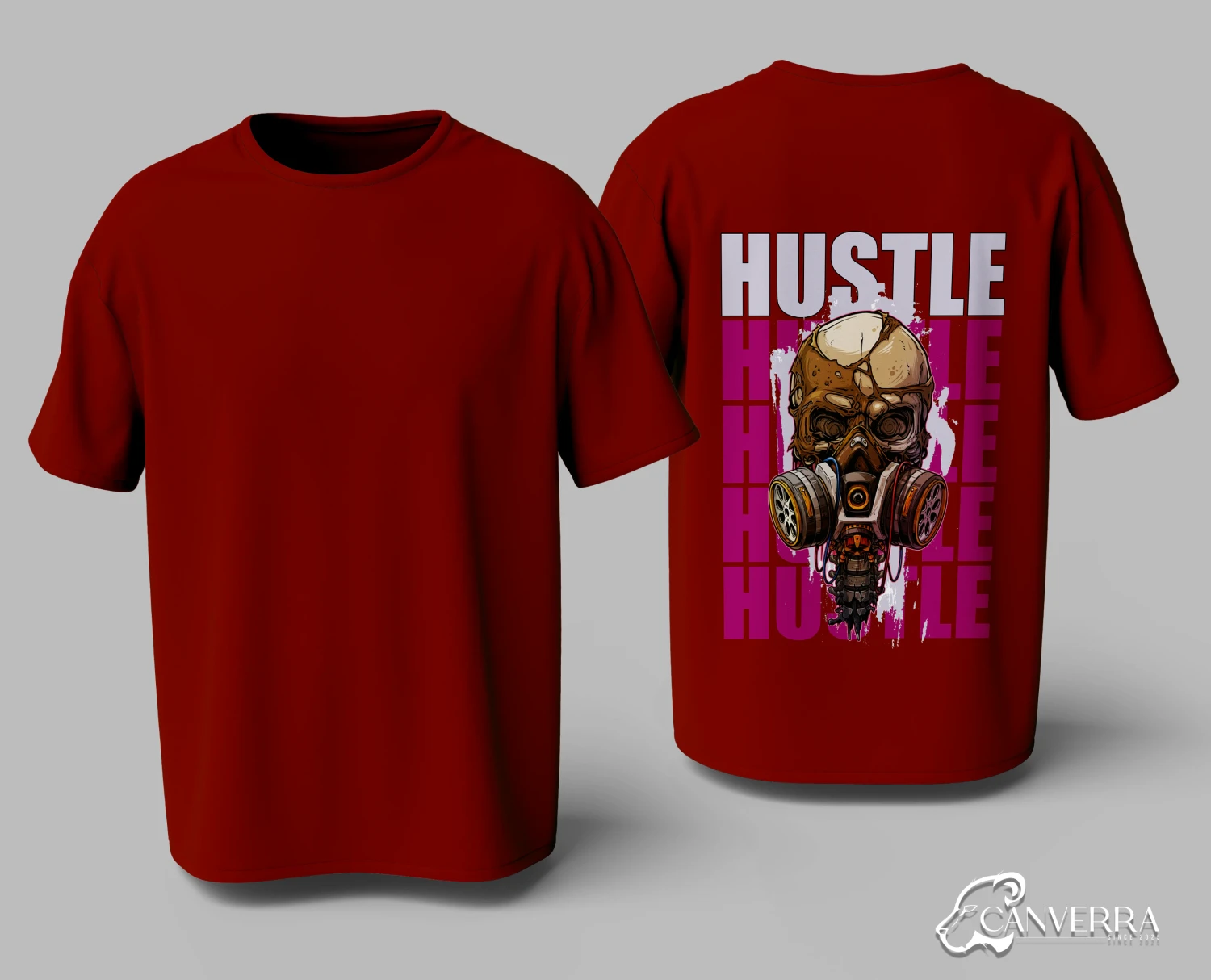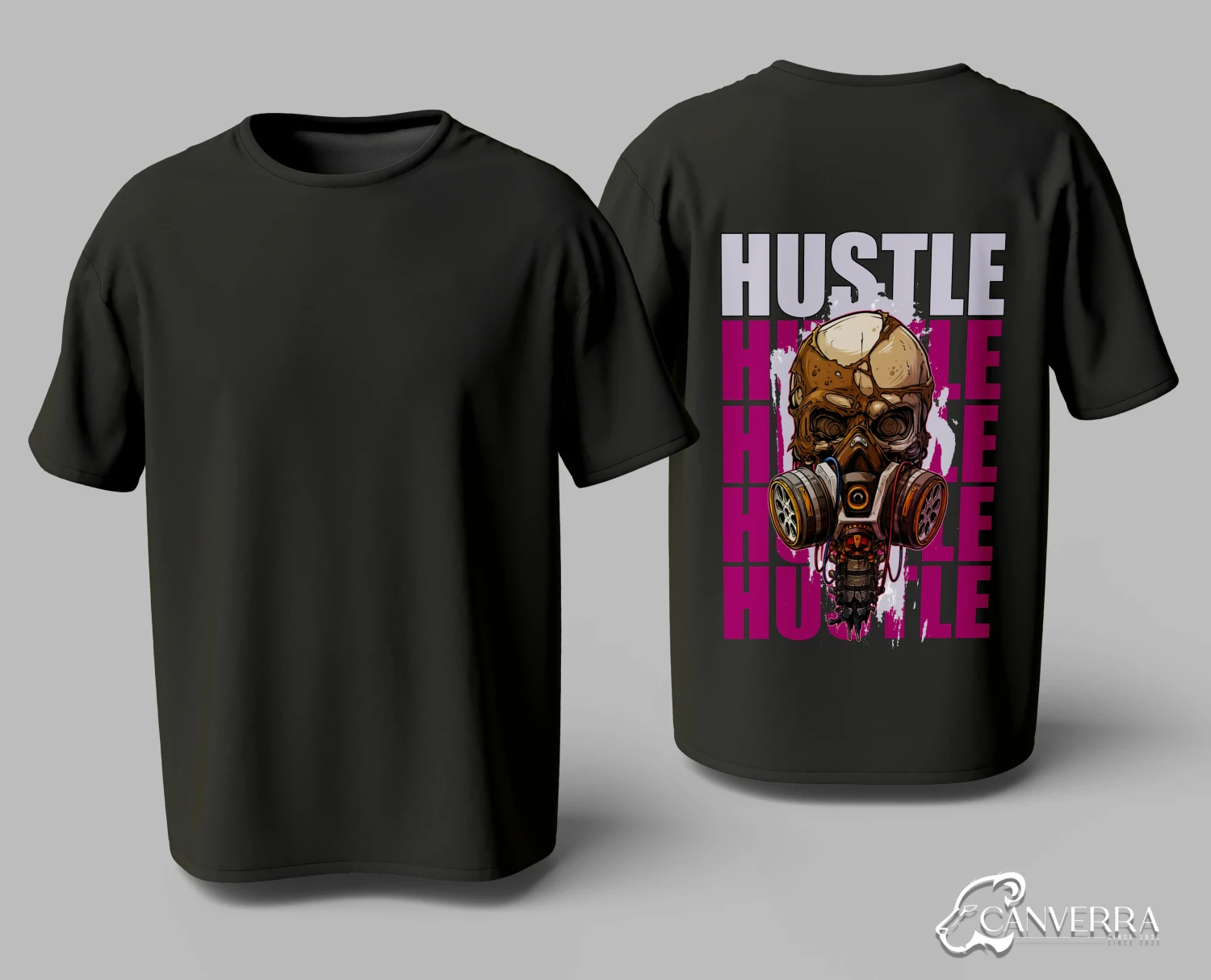 Bold Statement Graphic: Features a "Hustle" design with a dystopian gas mask skull on the back.