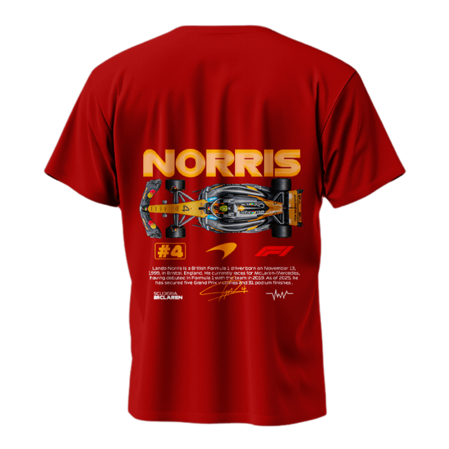 Celebrate racing excellence with the Lando Norris McLaren F1 #4 Driver T-shirt, featuring a dynamic overhead car graphic, Norris branding, and racing stats for true motorsport enthusiasts. Crafted from 240 GSM, 100% combed cotton, this tee offers a no-fade DTF print, bio-washed finish, and pre-shrunk durability in regular and oversize unisex fits. Perfect for Grand Prix events, F1 fans, and collectors seeking premium comfort and style.