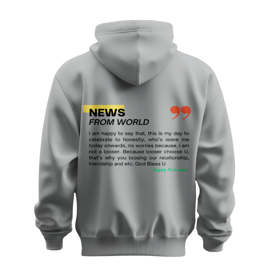 Step out with confidence in this "News From World" hoodie featuring a thoughtful reflection on relationships and positivity. Made from 240 GSM, 100% combed cotton and finished with durable DTF printing, it's bio-washed and pre-shrunk for unmatched comfort and enduring style in regular and oversize unisex fits. The bold, unique quote graphic delivers day-long inspiration and urban edge.