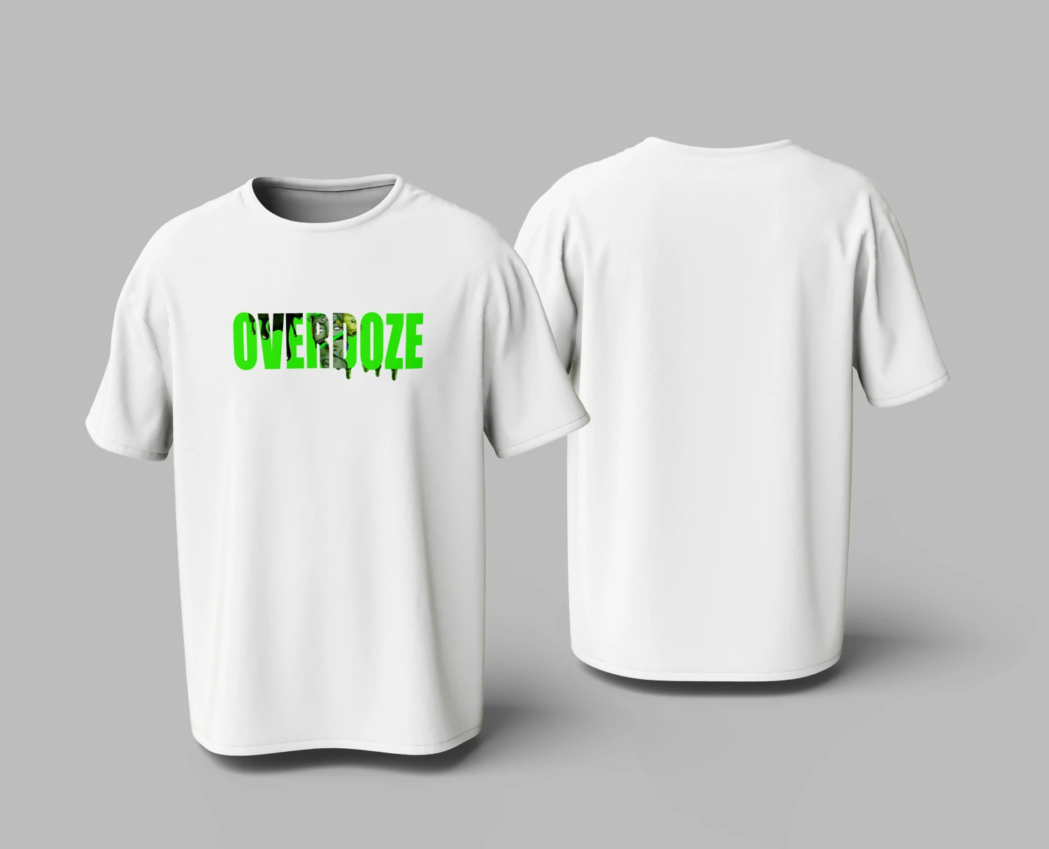 Edgy Streetwear Graphic: Features a vibrant, toxic-green "Overdoze" slime logo with a zombie character.