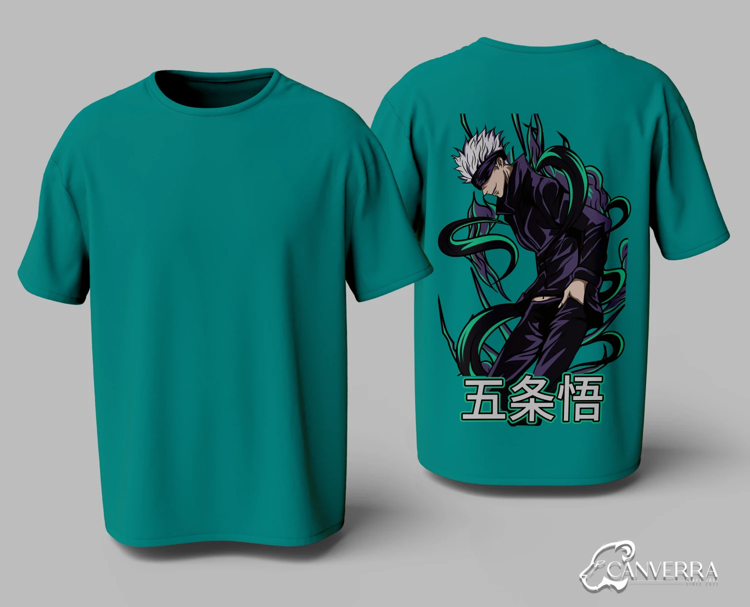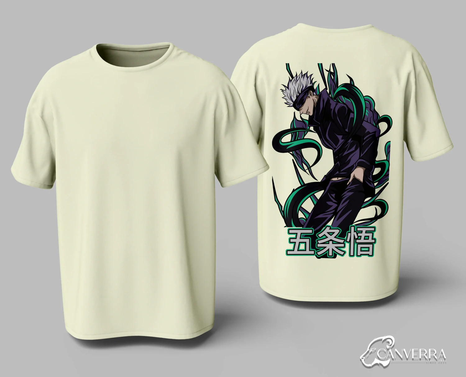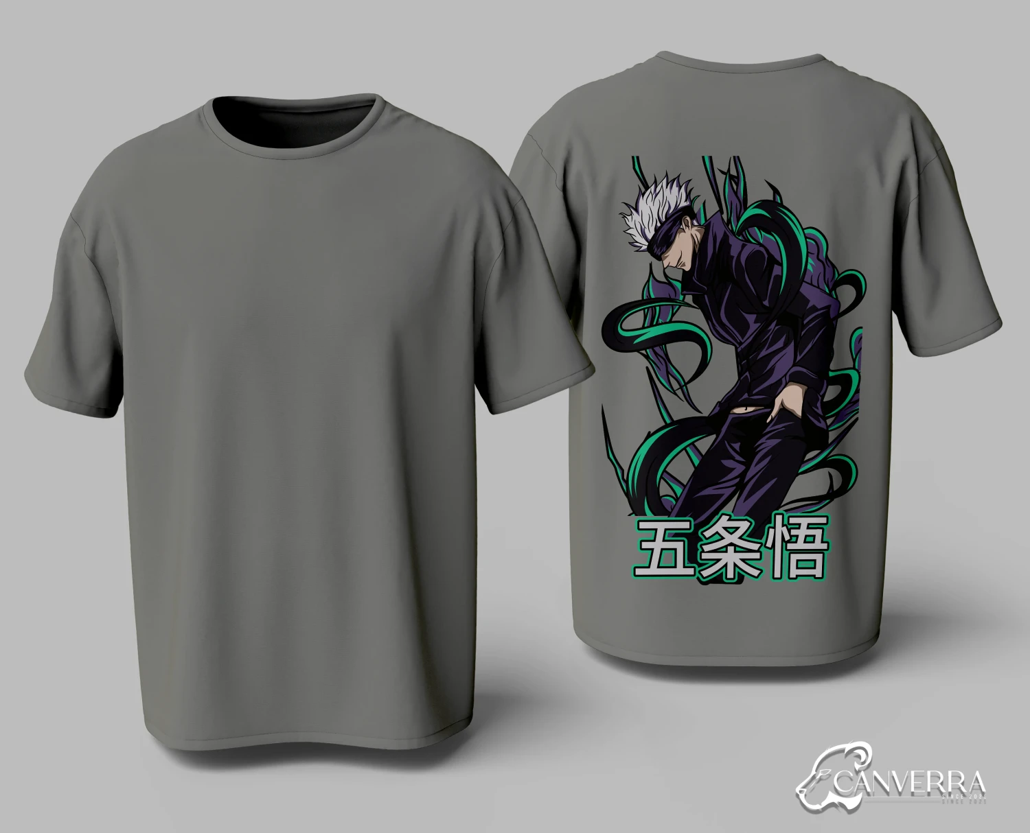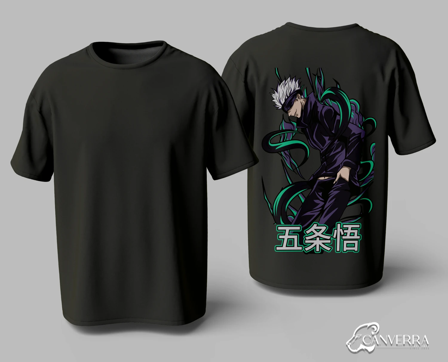 Dynamic Back Print: Features a powerful graphic of Satoru Gojo with iconic Japanese Kanji text.
