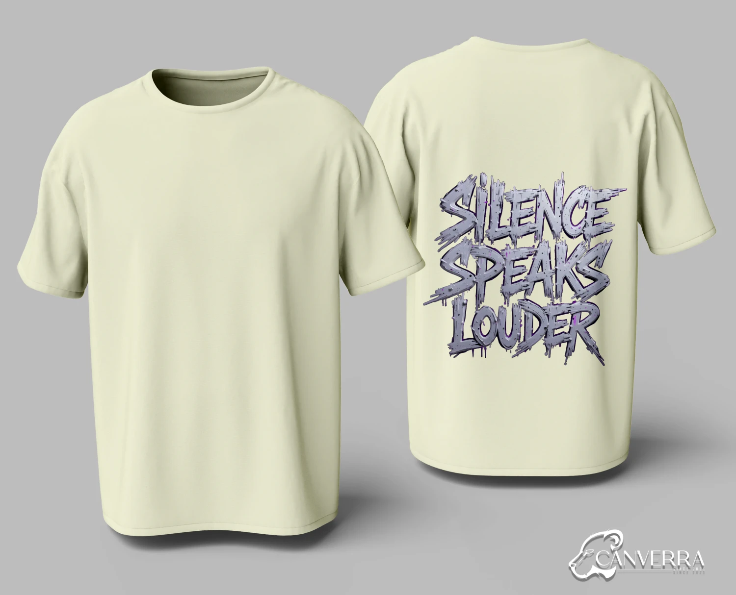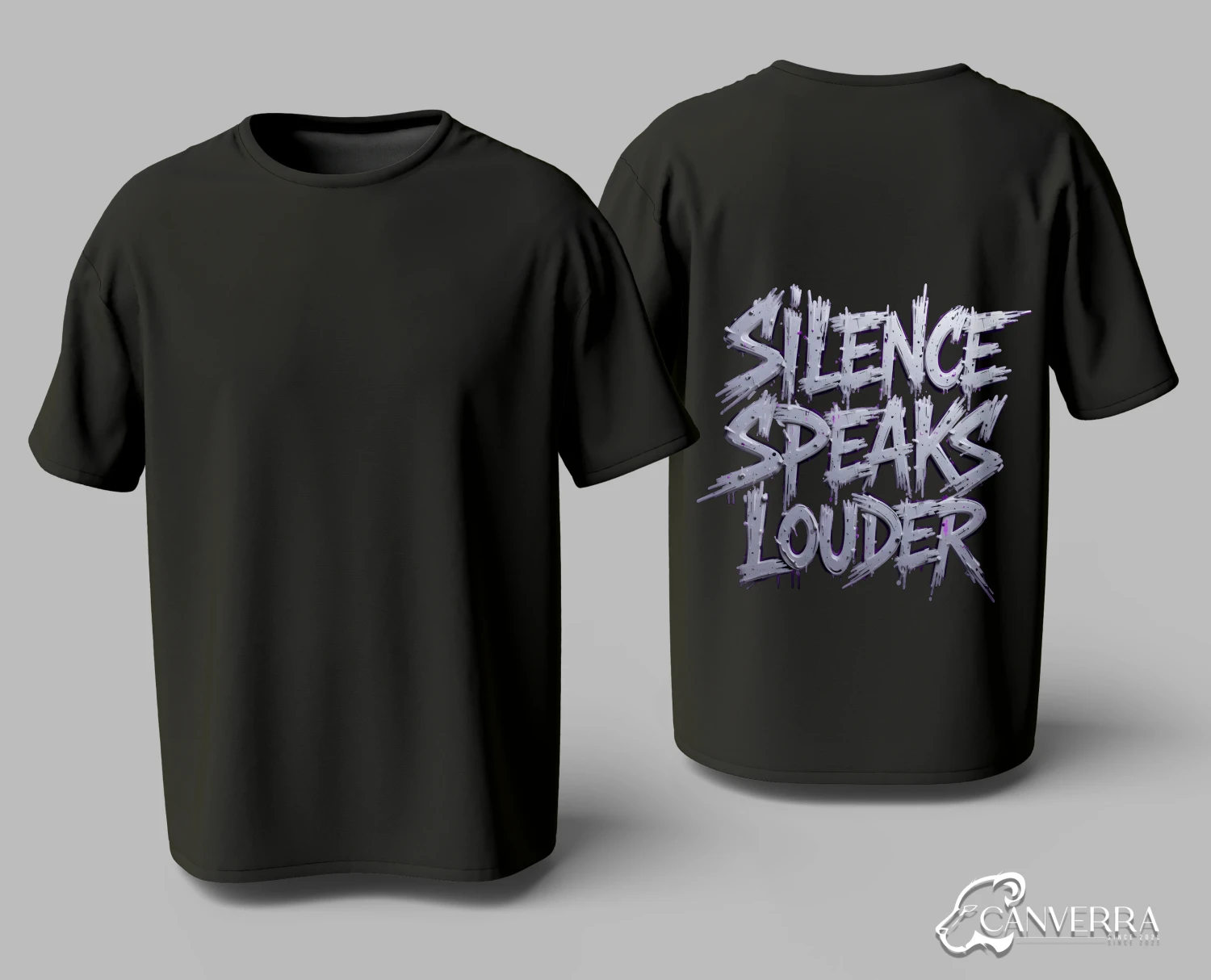 Edgy Back Print: Features a "Silence Speaks Louder" graphic in a bold, metallic graffiti style.
