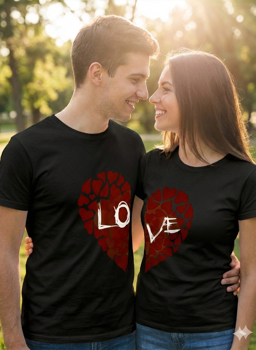 Celebrate your unique bond with these matching couple t-shirts, featuring a creative split-heart "LOVE" graphic that completes the picture when you stand together. Crafted from premium 180 GSM 100% combed cotton with a bio-washed finish, these unisex tees ensure breathable comfort and pre-shrunk durability for everyday wear. The vibrant, fade-resistant DTF print makes this set the perfect romantic gesture for anniversaries, Valentine's Day, or cute couple photoshoots.