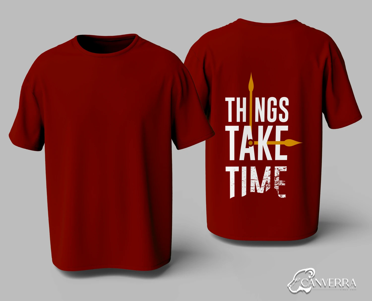 Motivational Back Print: Features a "Things Take Time" graphic with a minimalist clock design.