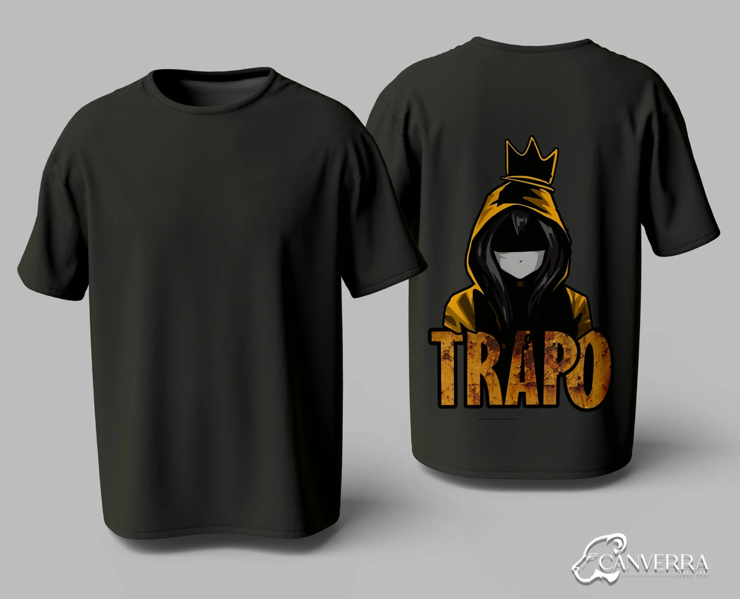 Mysterious Back Graphic: Features a bold design of a crowned, hooded character with "TRAPO" text.