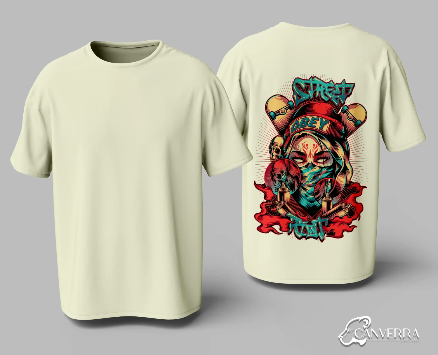 Intricate Street Art Graphic: Features a vibrant, graffiti-inspired design with spray can and skull details on the back.