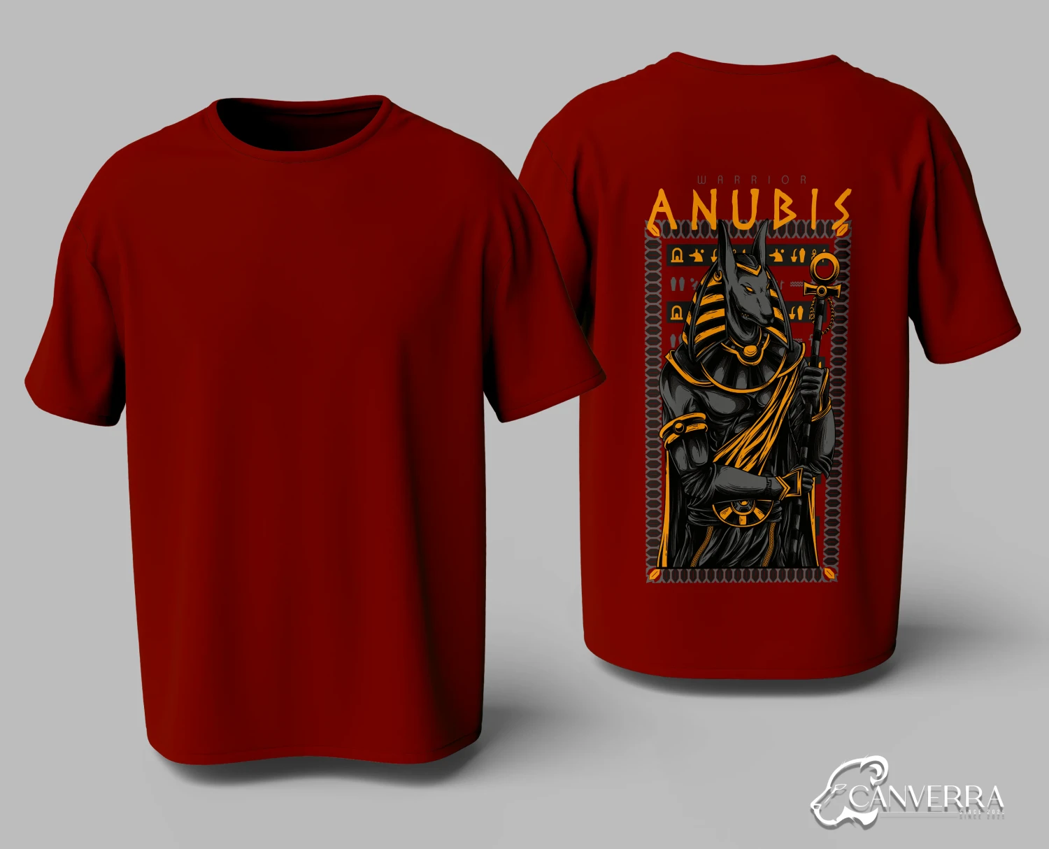 Striking Mythological Graphic: Features a bold, detailed back print of Anubis, the Egyptian warrior god.