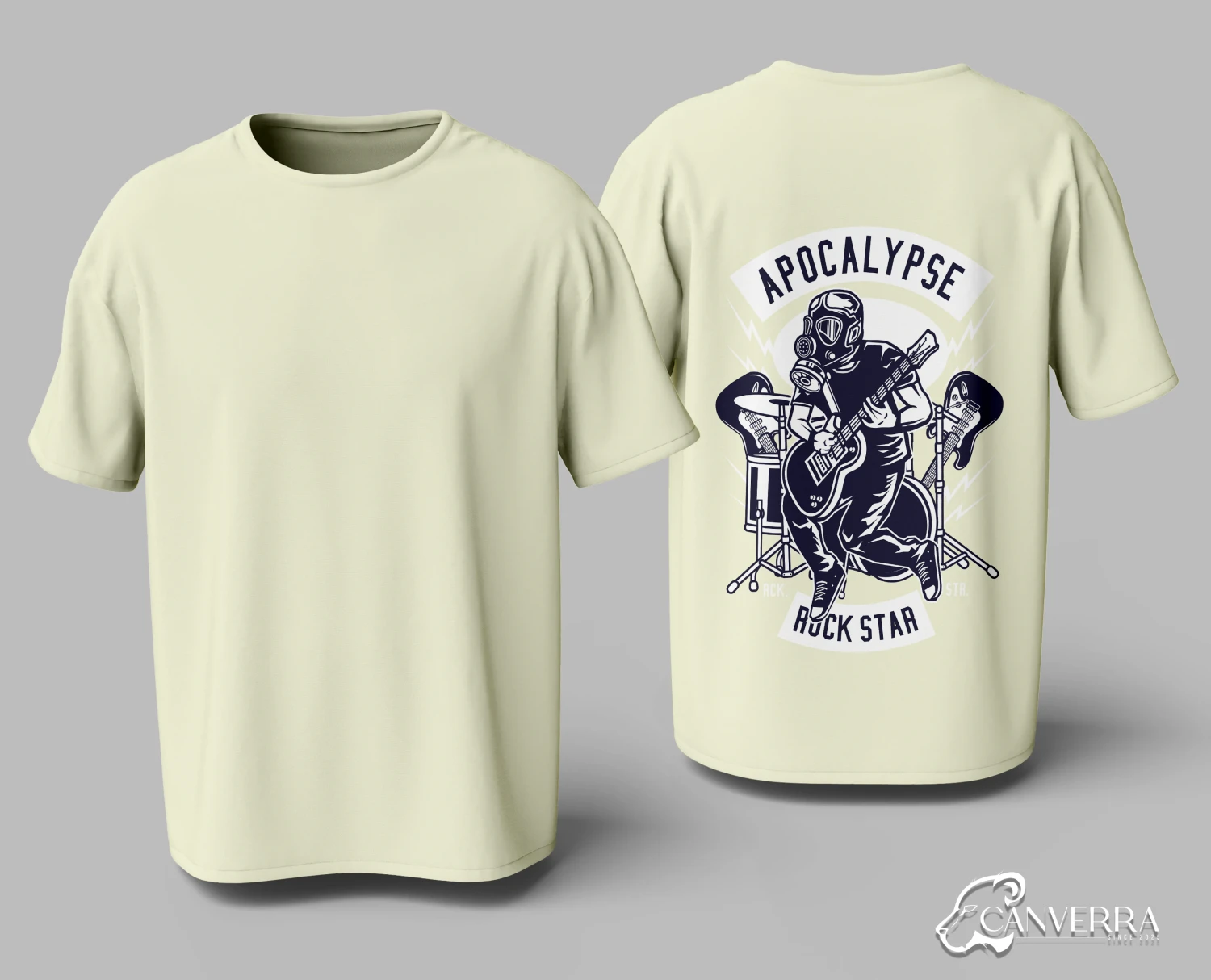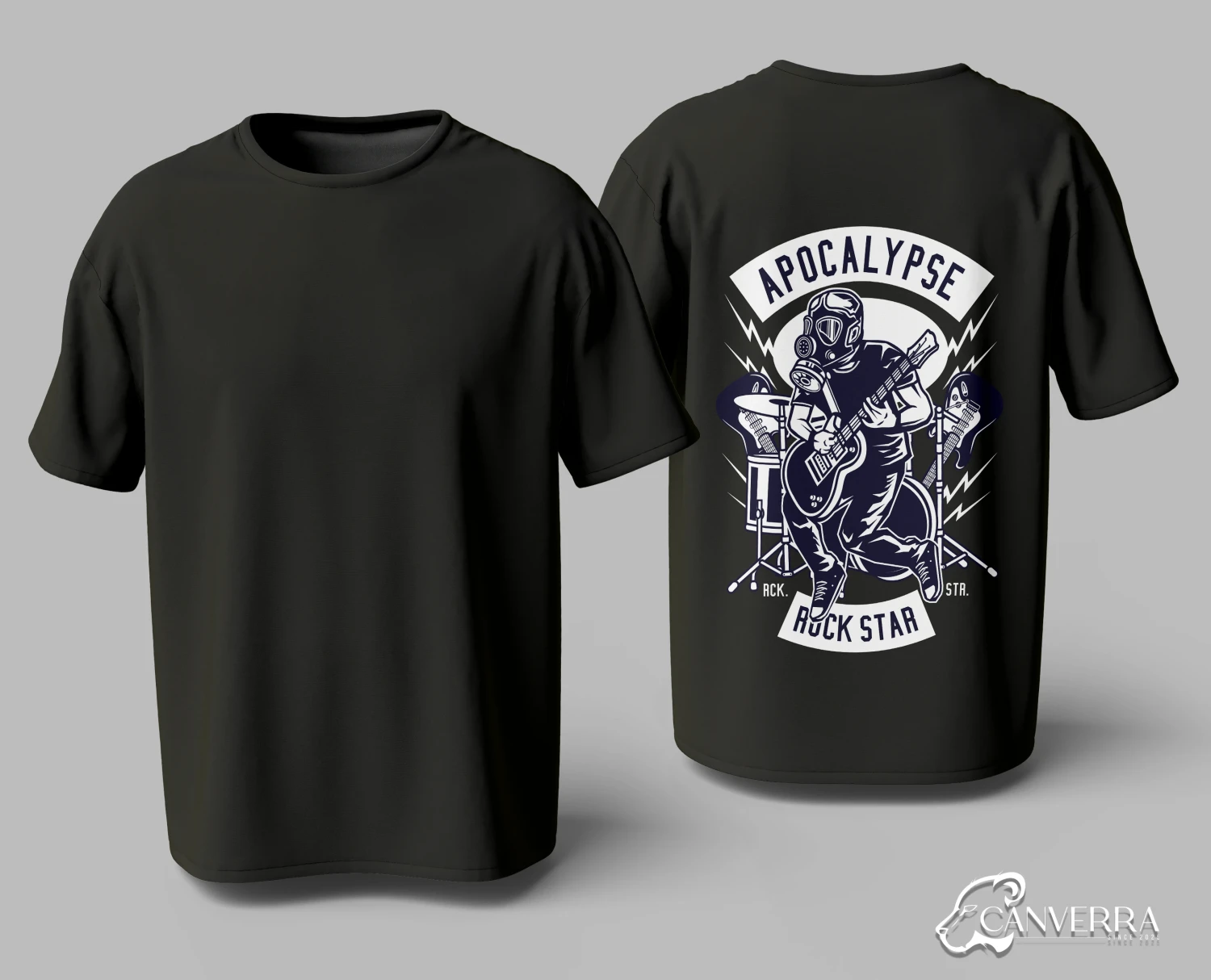 Edgy Back Graphic: Bold "Apocalypse Rock Star" design featuring a gas-masked guitarist.