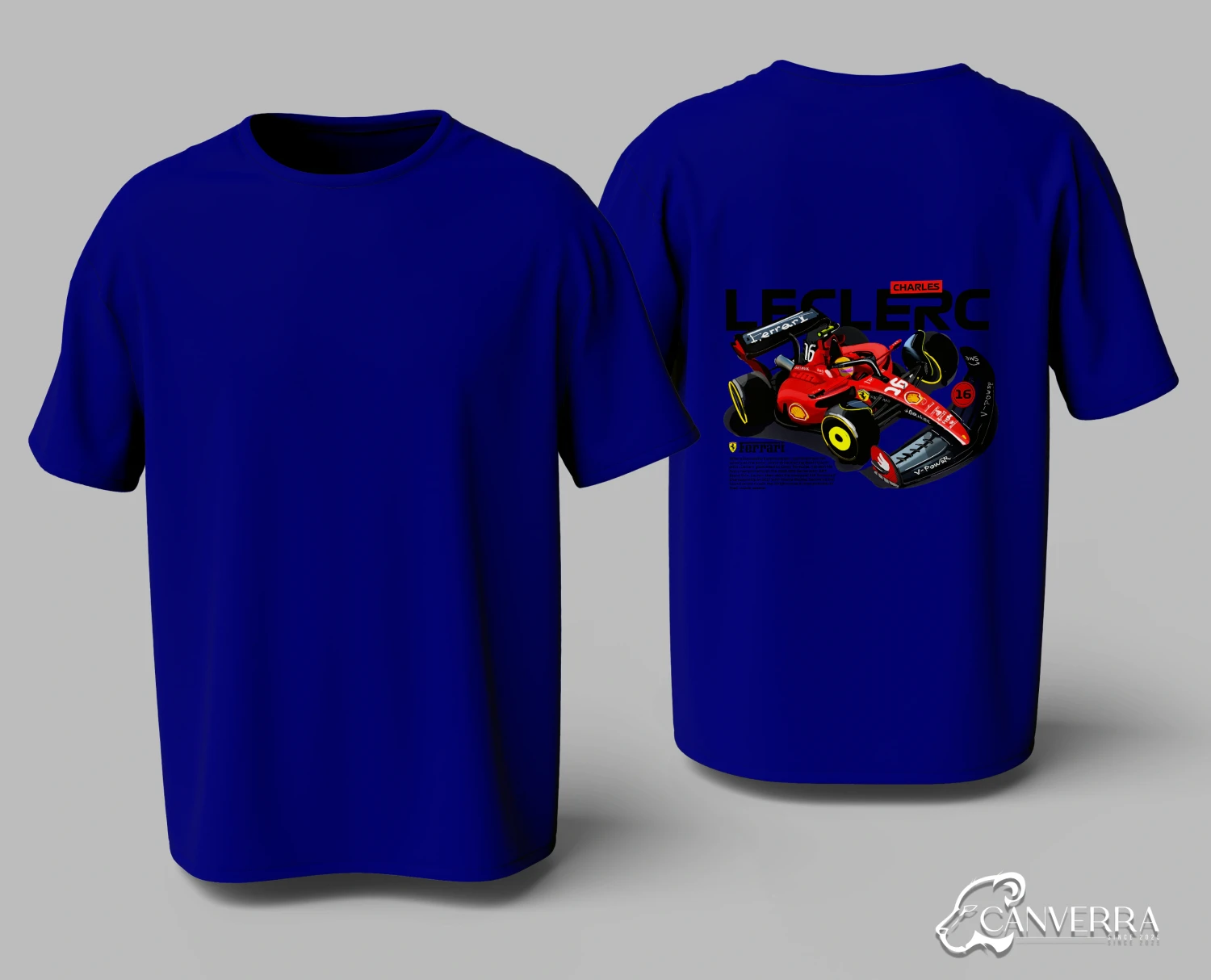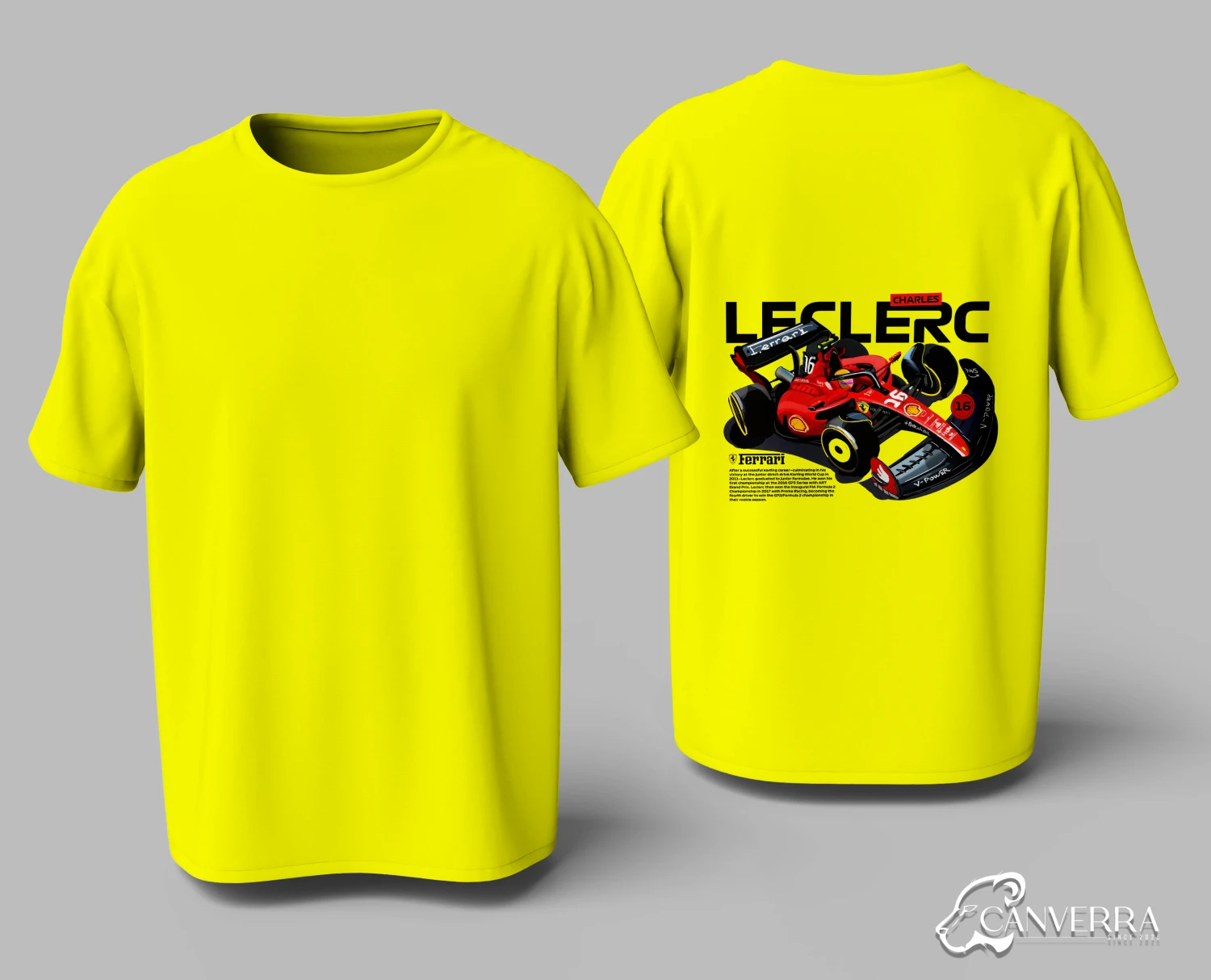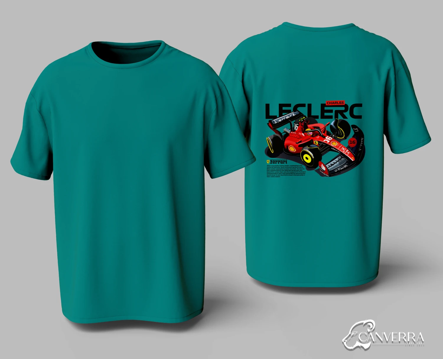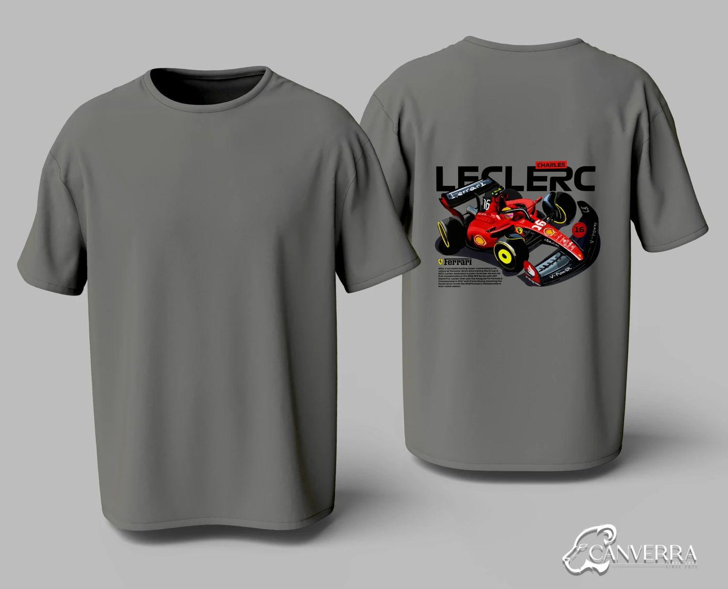 Driver Focused Design: Features a bold, illustrative back print of Charles Leclerc's #16 Ferrari F1 car.