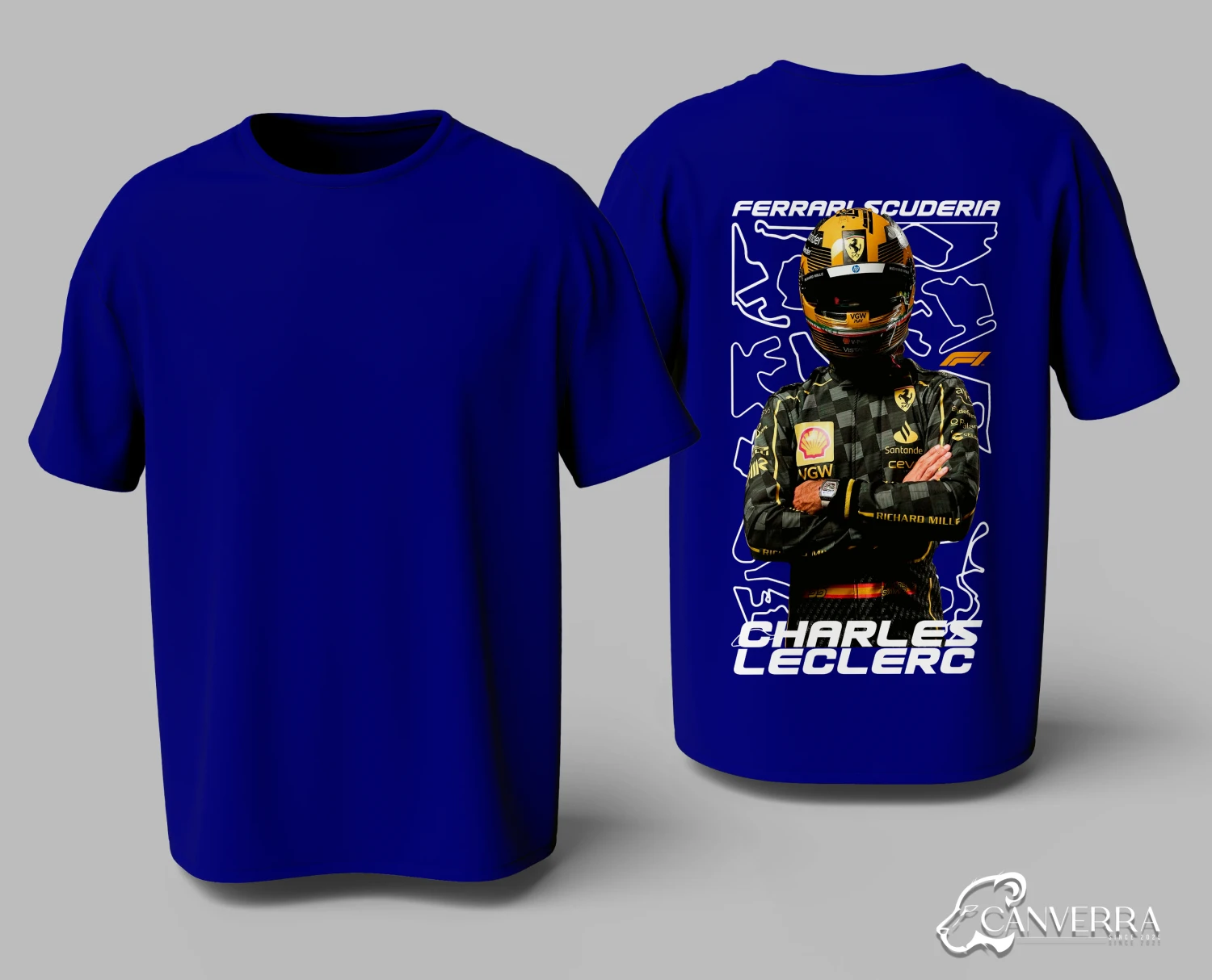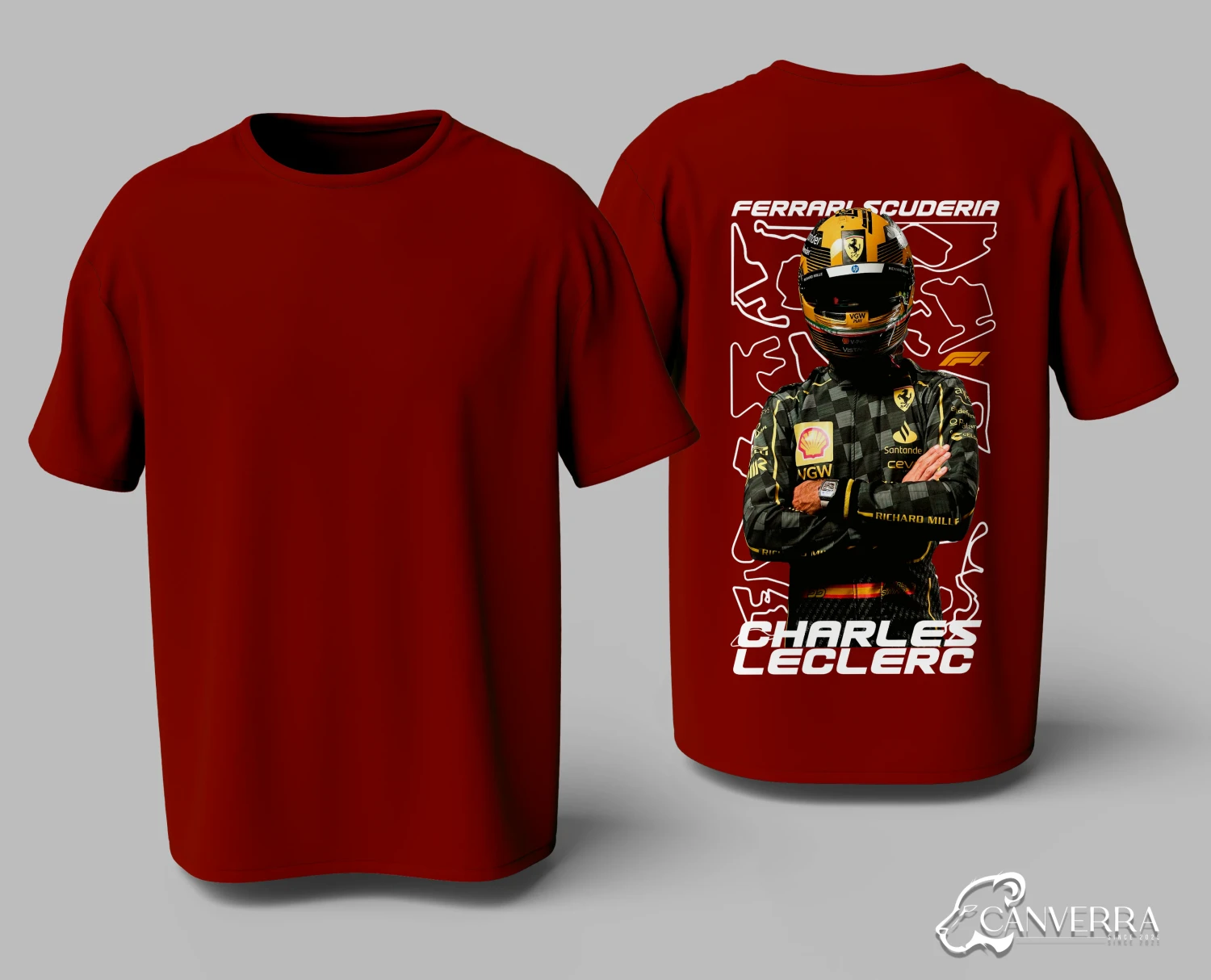Driver Tribute Design: Features a bold back print of Charles Leclerc in his Ferrari race gear, set against a stylish track outline.