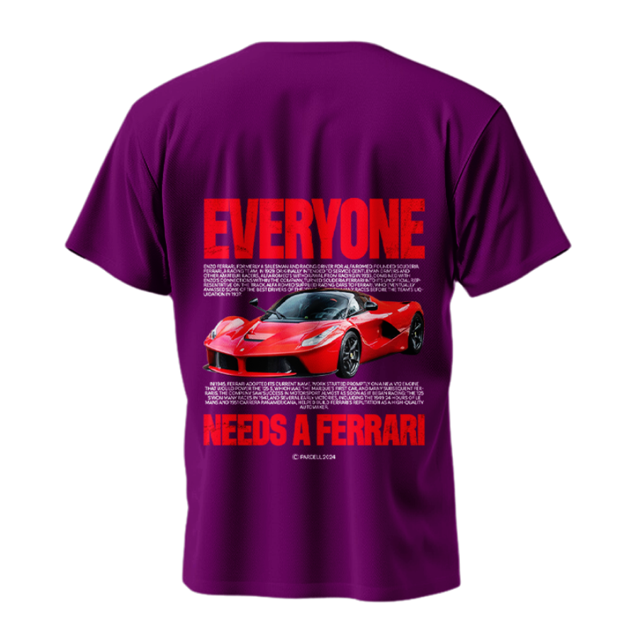 Rev up your style with the Ferrari Supercar Tribute T-shirt, featuring a striking red Ferrari graphic and bold "Everyone Needs a Ferrari" statement. Crafted from premium 240 GSM, 100% combed cotton, this tee combines a vibrant, no-fade DTF print with bio-washed, pre-shrunk durability in regular and oversize unisex fits. Ideal for car enthusiasts, racing fans, and collectors.