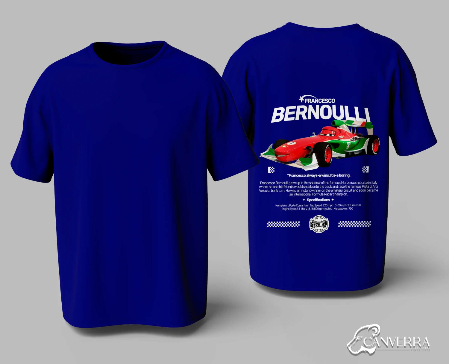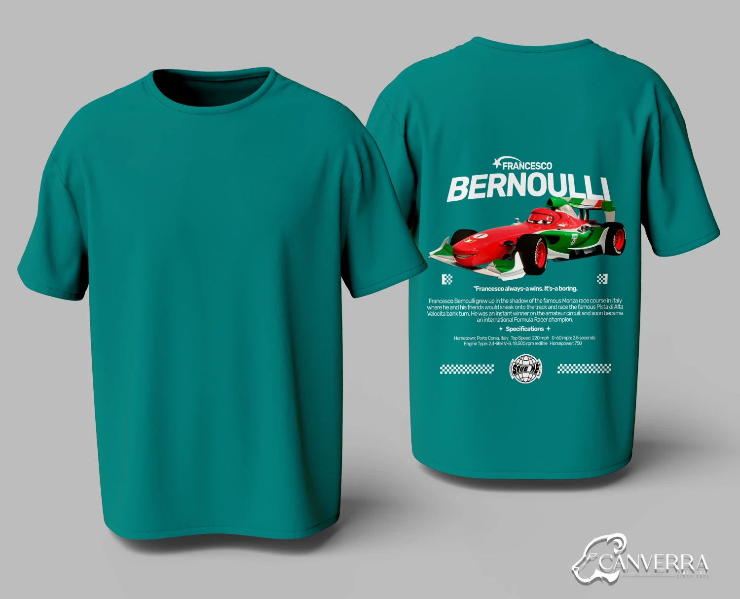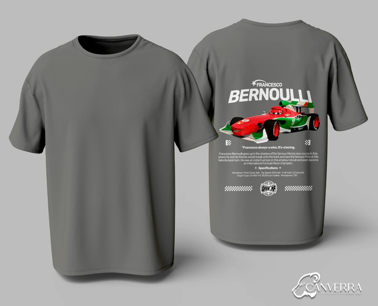 Celebrate the legendary Italian racer from Cars 2 with our exclusive Francesco Bernoulli T-shirt. This tee features a detailed back print showcasing the champion's car, stats, and iconic quote, making it a must-have for fans. Crafted from premium 240GSM, 100% combed cotton, it combines nostalgic movie fandom with superior comfort and streetwear style.