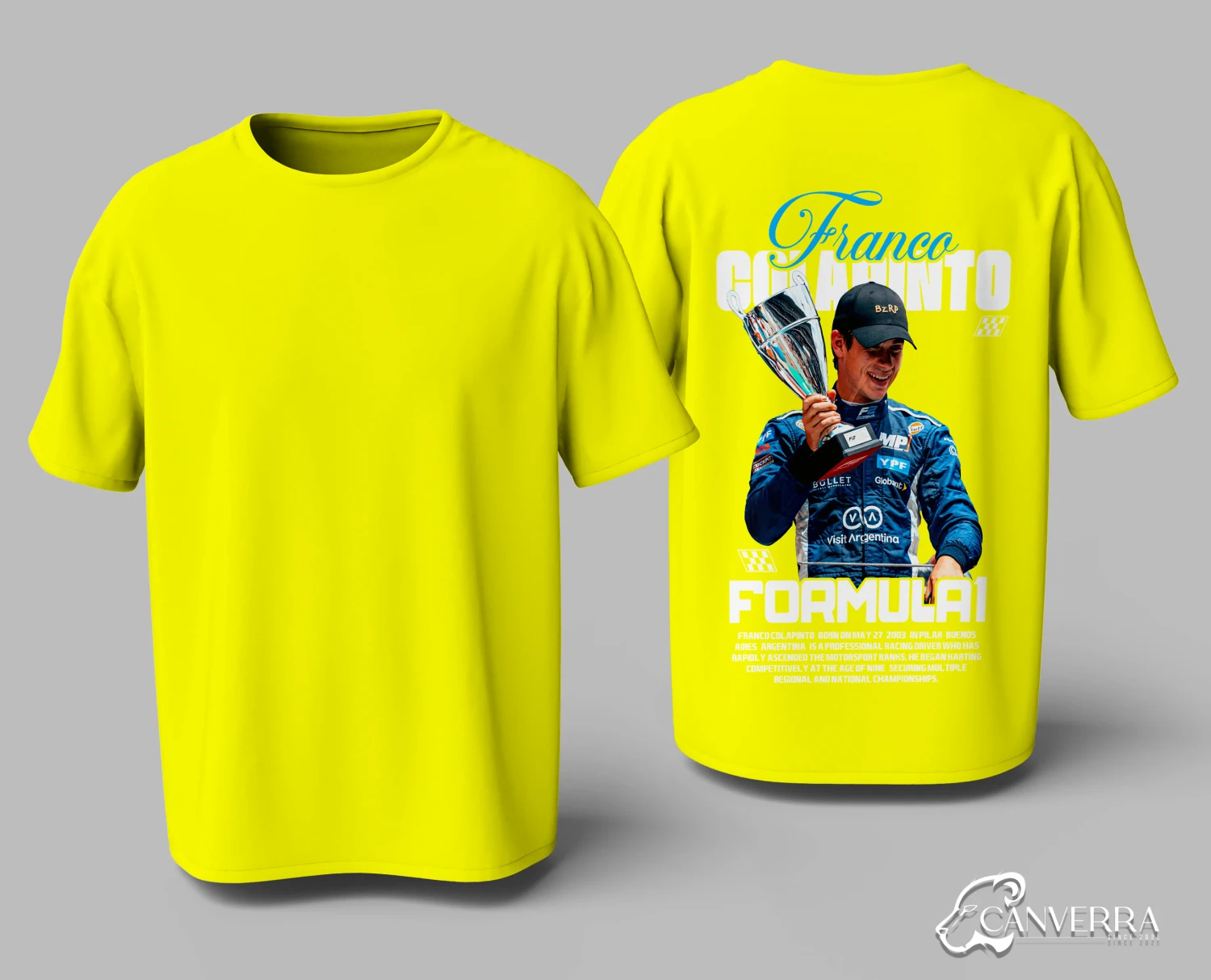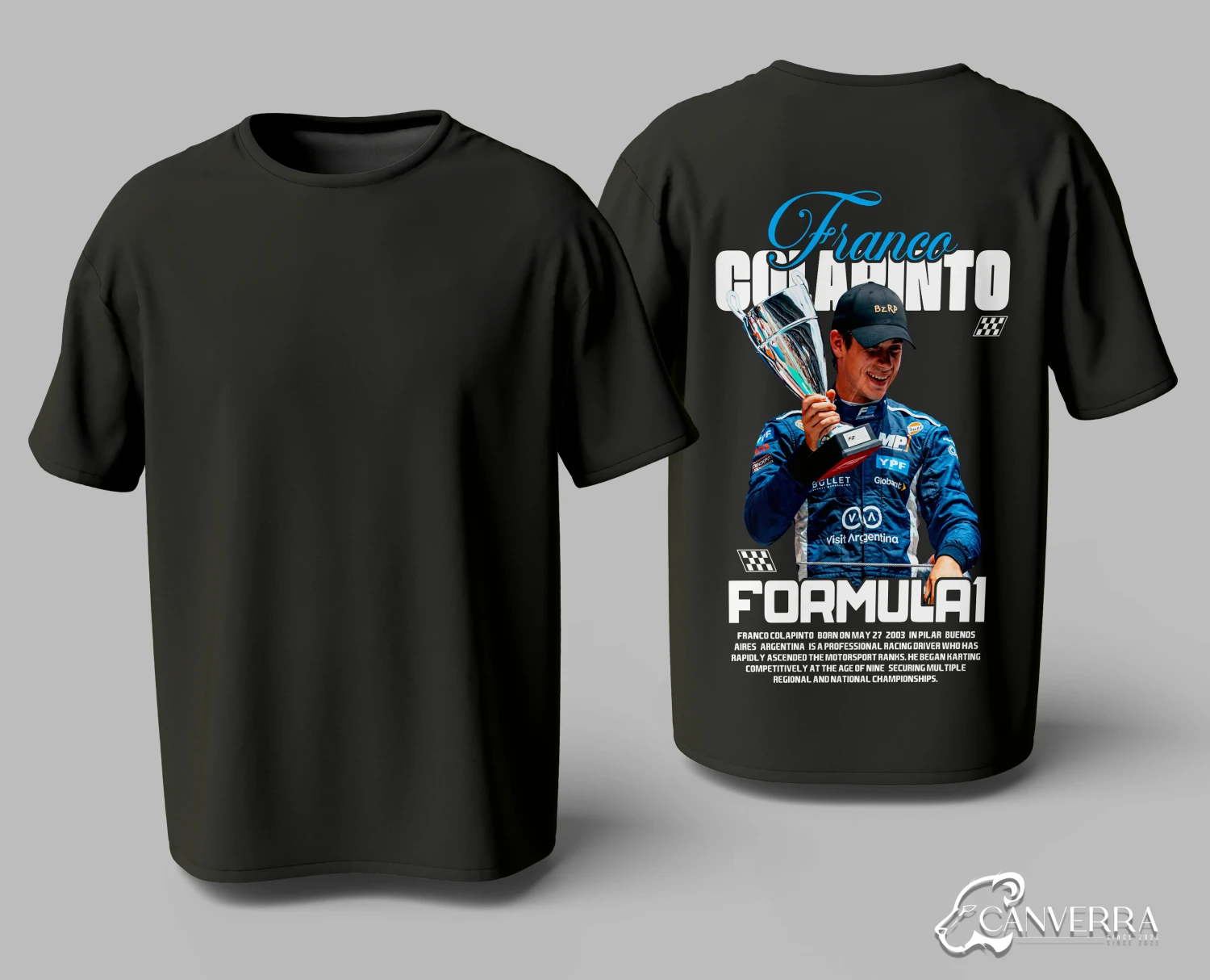 Celebrate the journey of Formula 1's rising Argentinian star with our exclusive Franco Colapinto tribute T-shirt. The back features a high-impact graphic of the driver celebrating his success, making it a must-have piece for his dedicated fanbase. Crafted from premium 240GSM, 100% combed cotton, this tee lets you show your support in ultimate comfort and style.