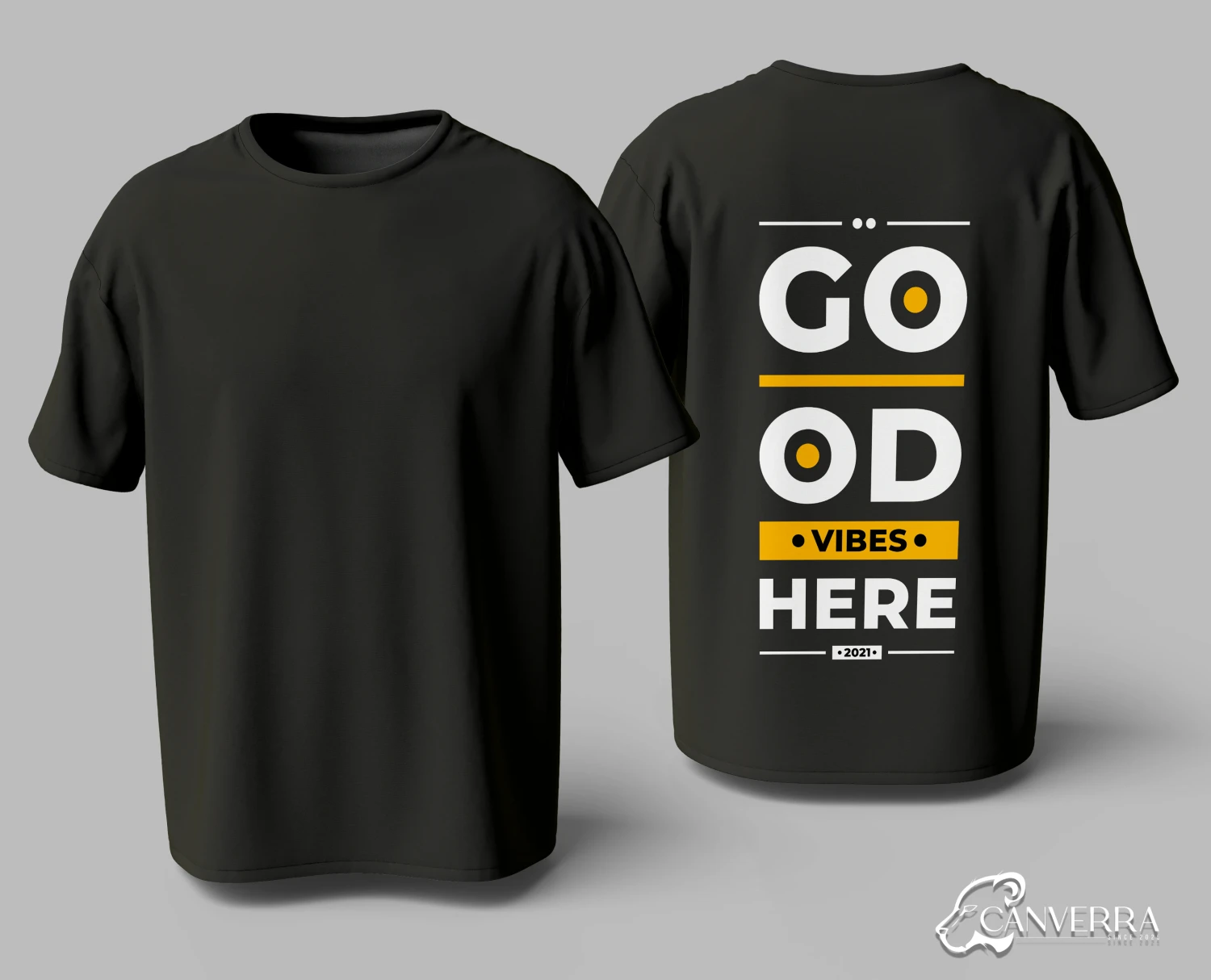 Bold Back Print: Features a minimalist "Good Vibes Here" typographic design for a modern statement.