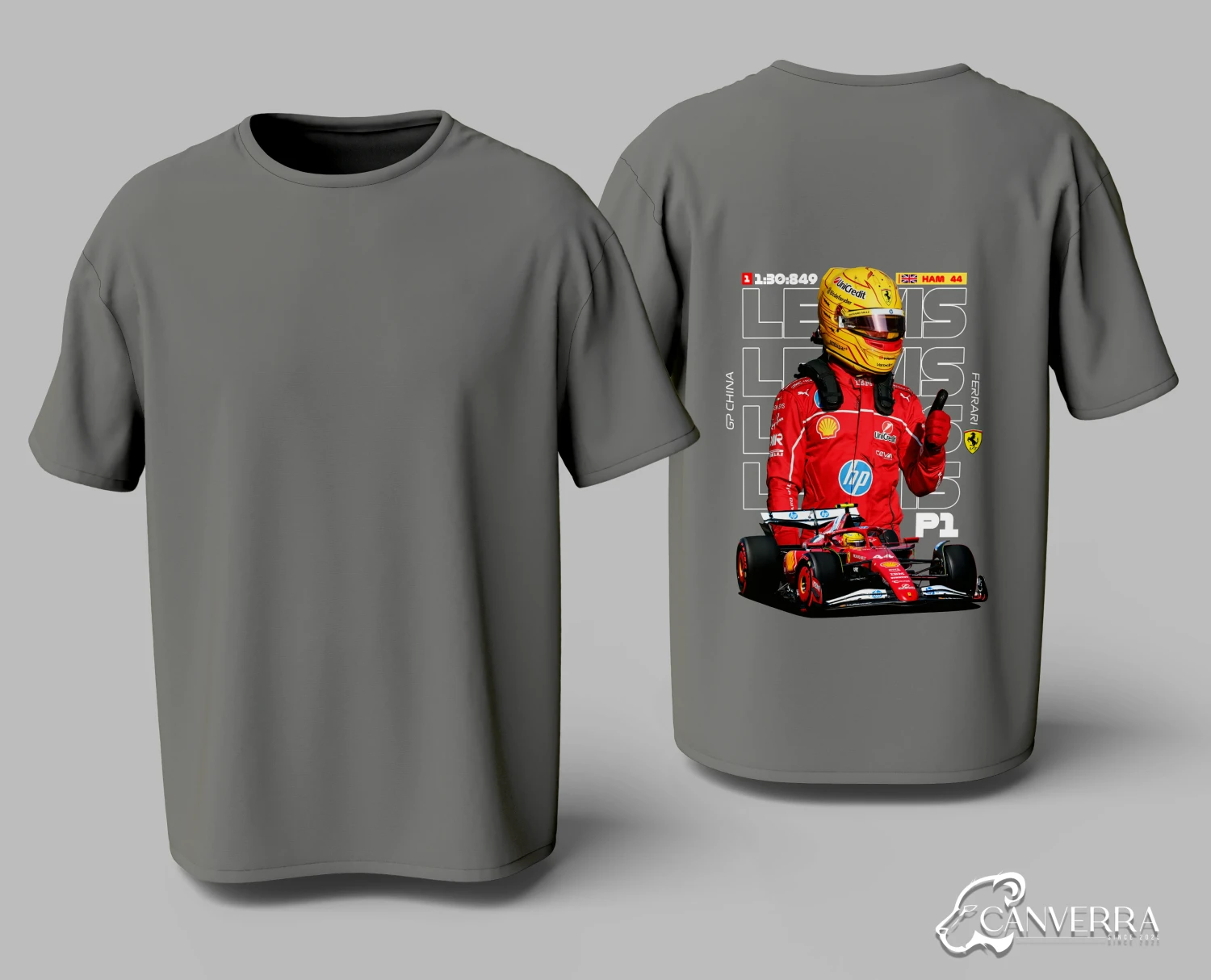 Capture a moment of triumph with this Lewis Hamilton P1 victory tee, celebrating his success with Ferrari. The dynamic back graphic immortalizes a winning moment, making it a must-have for any fan. Crafted from premium, heavyweight 240GSM combed cotton, this shirt offers unparalleled comfort and style, perfect for the track or the street.
