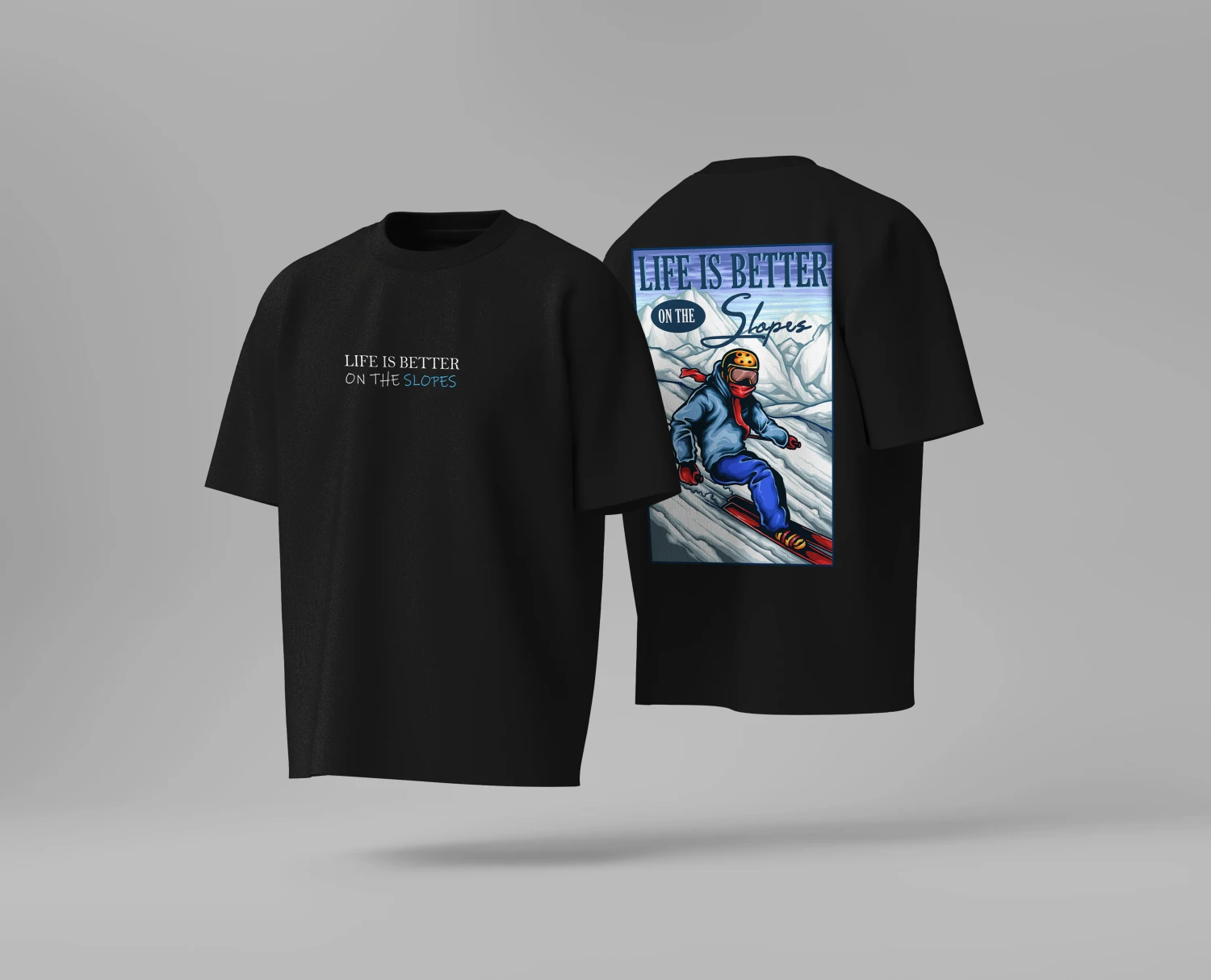Dynamic Back Graphic: Features a large, detailed "Life Is Better On The Slopes" snowboarder design.