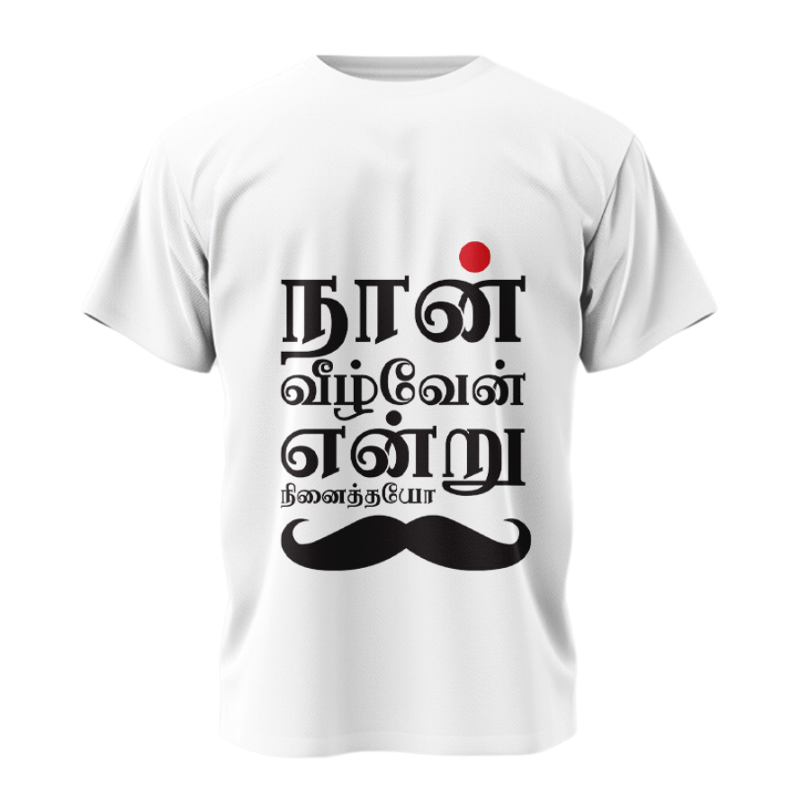 Unleash your inner strength with the empowering "Naan Veezhven Endru Ninaithayo" Tamil quote tee, featuring bold typography, a symbolic red dot, and a classic moustache graphic. This motivational T-shirt is crafted from heavy 180 GSM combed cotton with a no-fade screen print, promising unmatched durability and style. Bio-washed and pre-shrunk, it’s perfect for daily wear, gifting, or inspiring your vibe at college and events.