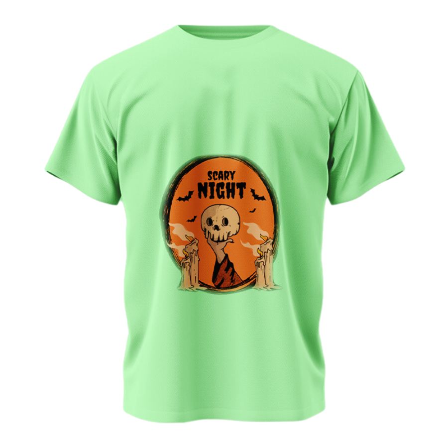 Step into the eerie spirit of Halloween with the Scary Night T-shirt, featuring a haunting skull-in-hand graphic surrounded by candles and bats. Crafted from 240 GSM, 100% combed cotton, this durable DTF print tee stays fresh with bio-washed and pre-shrunk finish, promising all-day comfort. Available in regular and oversize unisex fits for perfect fright-night style.