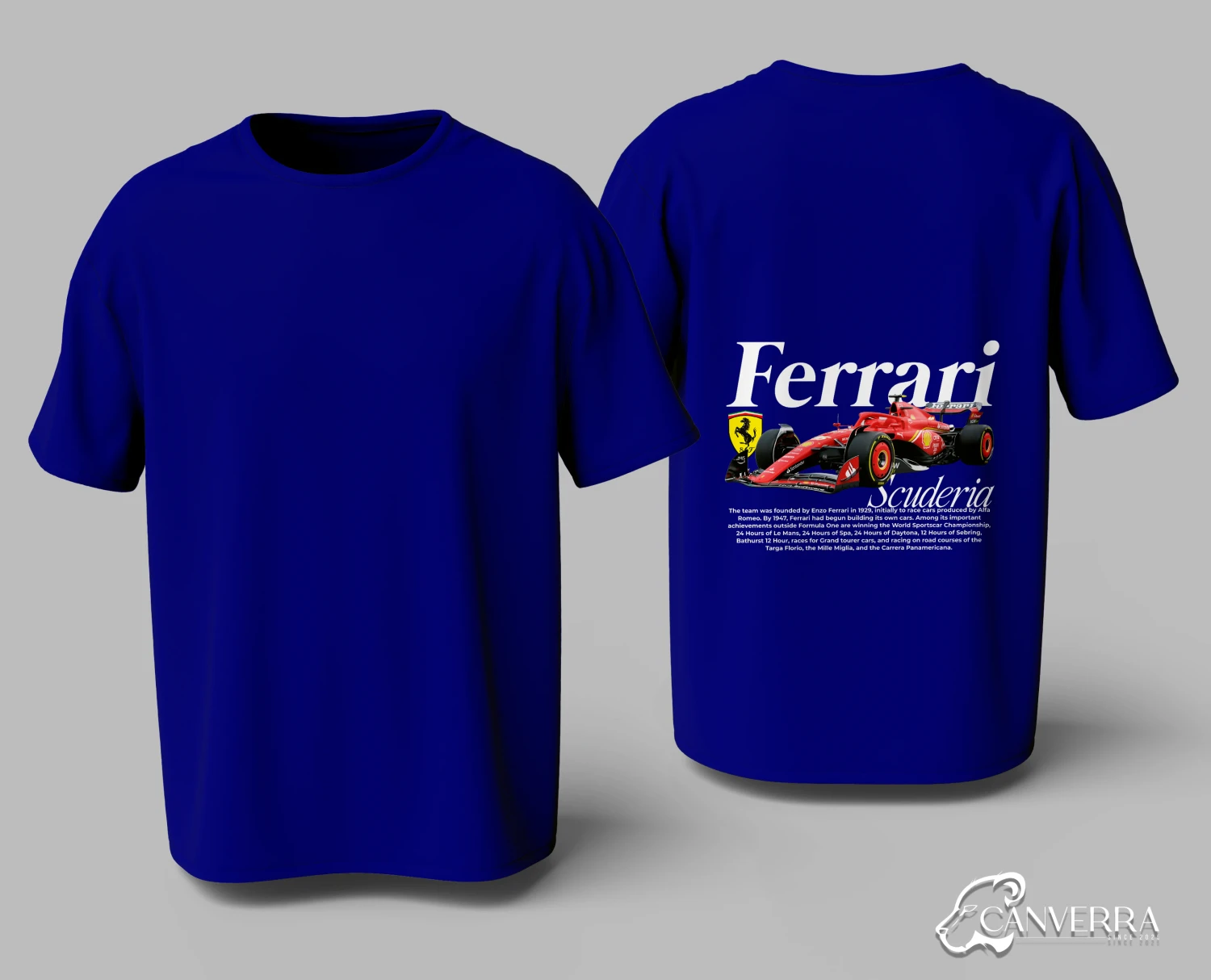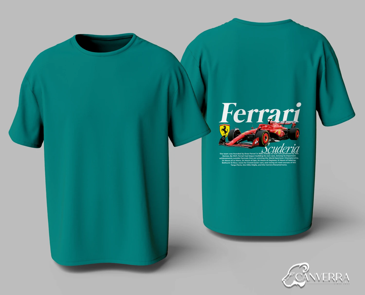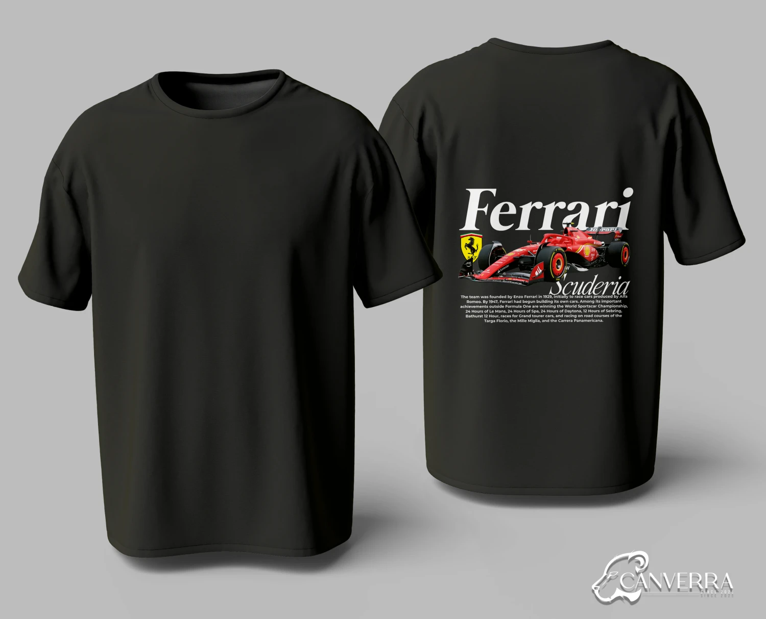 Historic Back Print: Features a detailed Scuderia Ferrari F1 car graphic and text celebrating the team's rich racing heritage.