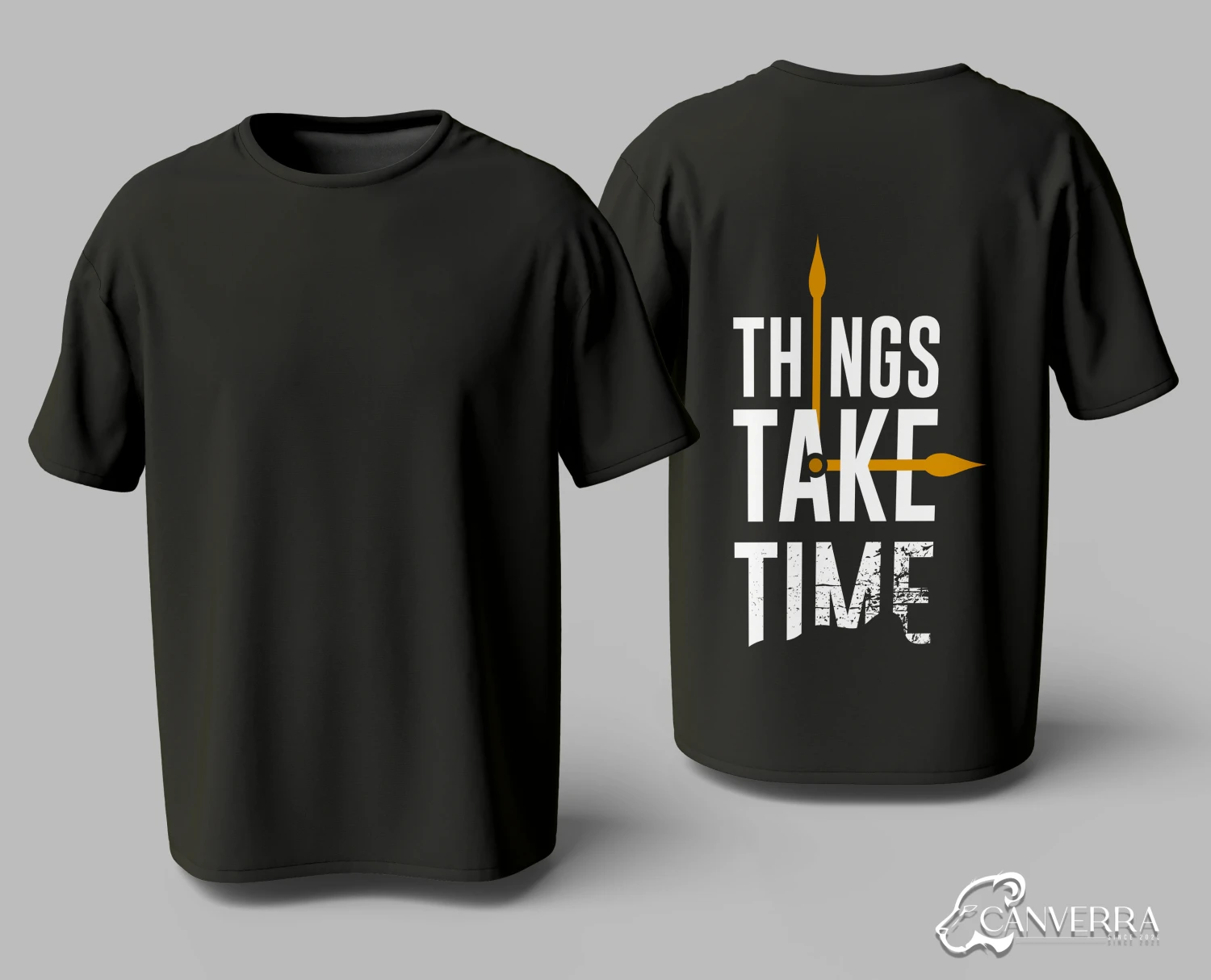 Motivational Back Print: Features a "Things Take Time" graphic with a minimalist clock design.