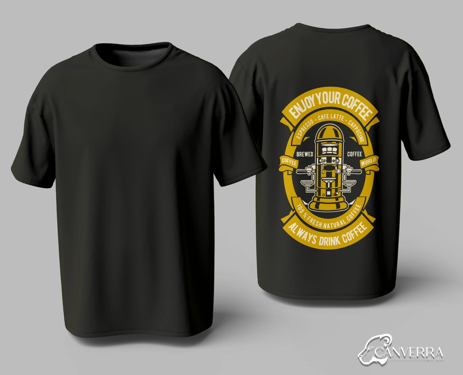Retro Coffee Emblem: Features a classic "Enjoy Your Coffee" design on the back, perfect for any caffeine enthusiast.