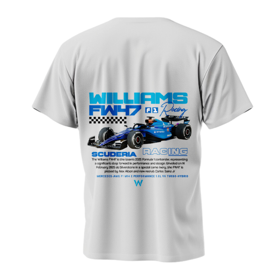 Celebrate F1 innovation with the Williams FW47 Formula 1 Racing T-shirt, featuring a detailed car graphic and dynamic team branding for maximum motorsport impact. Designed in 240 GSM, 100% combed cotton, this tee offers long-lasting durability, a no-fade DTF print, and exceptional comfort in regular and oversize unisex fits. Perfect for avid Formula 1 fans, events, and racing collectors.